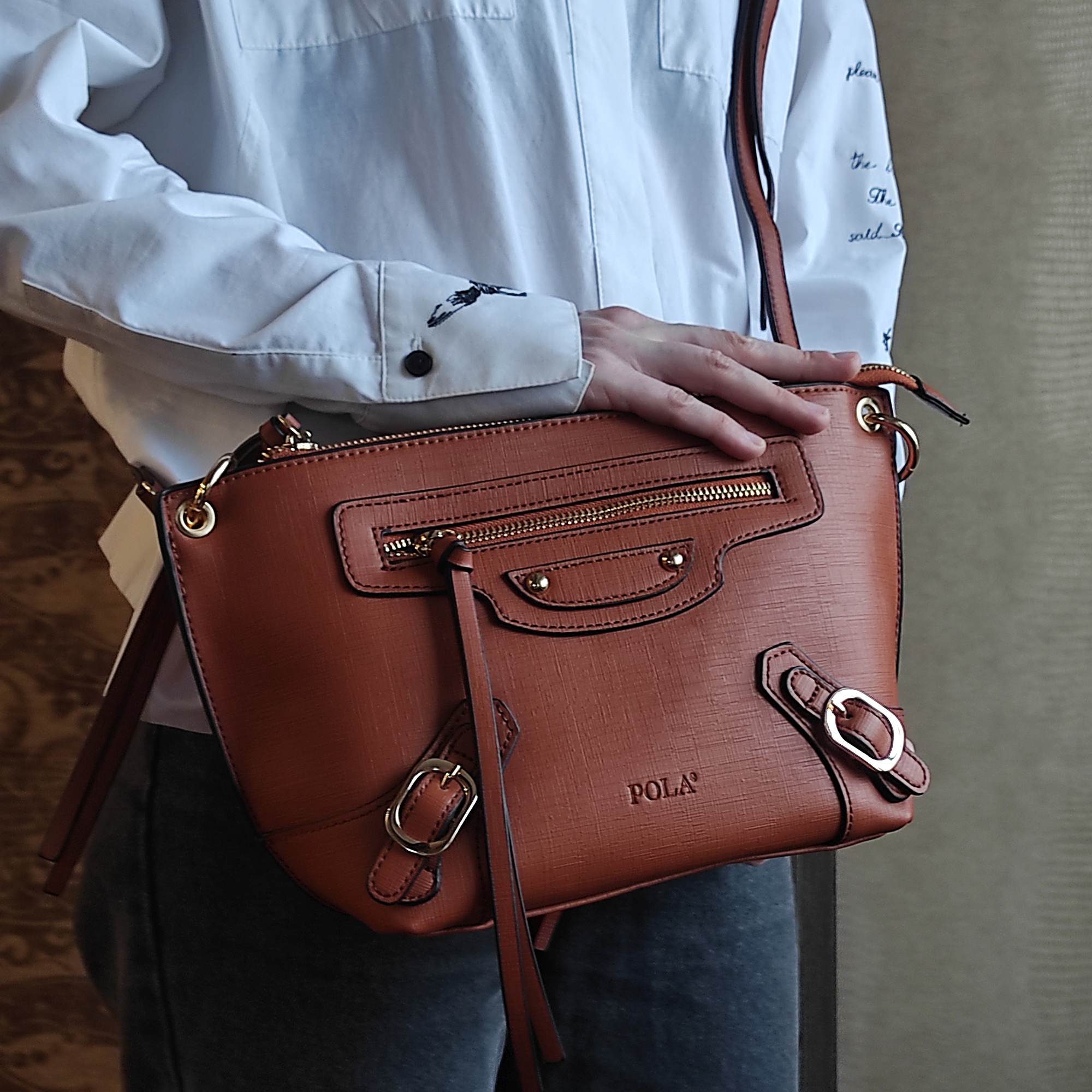 Женская сумка кросс-боди Pola выполнена из экокожи и прекрасно подходит для повседневного использования. Основное отделение закрывается на металлическую молнию. Внутри основного отделения есть два открытых кармана и карман на молнии. Сзади сумки также имеется карман на молнии. Спереди модель украшена короткими ремешками с пряжками заклепками, есть накладной карман на молнии для мелочей. У модели есть съёмный регулируемый ремень, длина которого составляет 137 см. Цвет фурнитуры-золото.