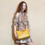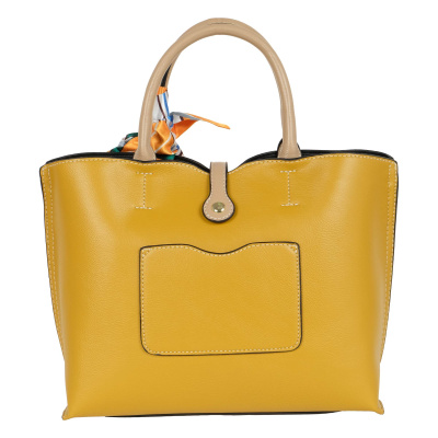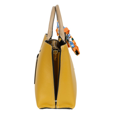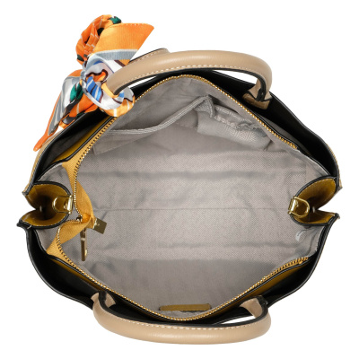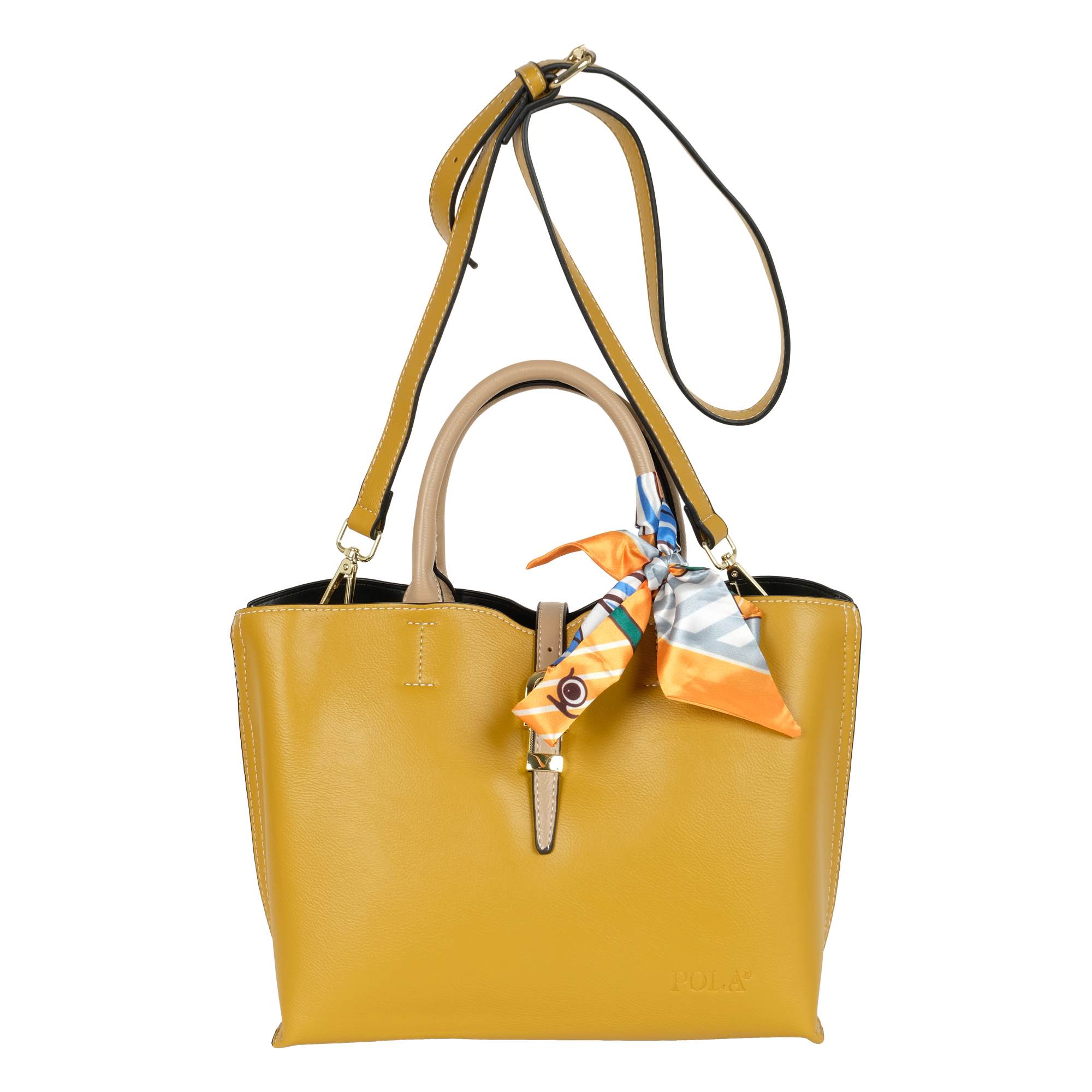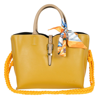 Стильная женская сумка-тоут с двумя ручками для переноски фирмы Pola выполнена из экокожи и украшена платком. Основное отделение закрывается на магнитную кнопку. Внутри сумка разделена кармашком на молнии на два отделения. Внутри кармашка есть маленький карман на молнии и два открытых кармашка. Сзади накладной открытый кармашек визитница. Высота ручек 14 см. У данной модели есть два съёмных ремня, максимальная длина регулируемого из экокожи которого составляет 123 см, второй из текстиля 83 см. Цвет фурнитуры-золотой.