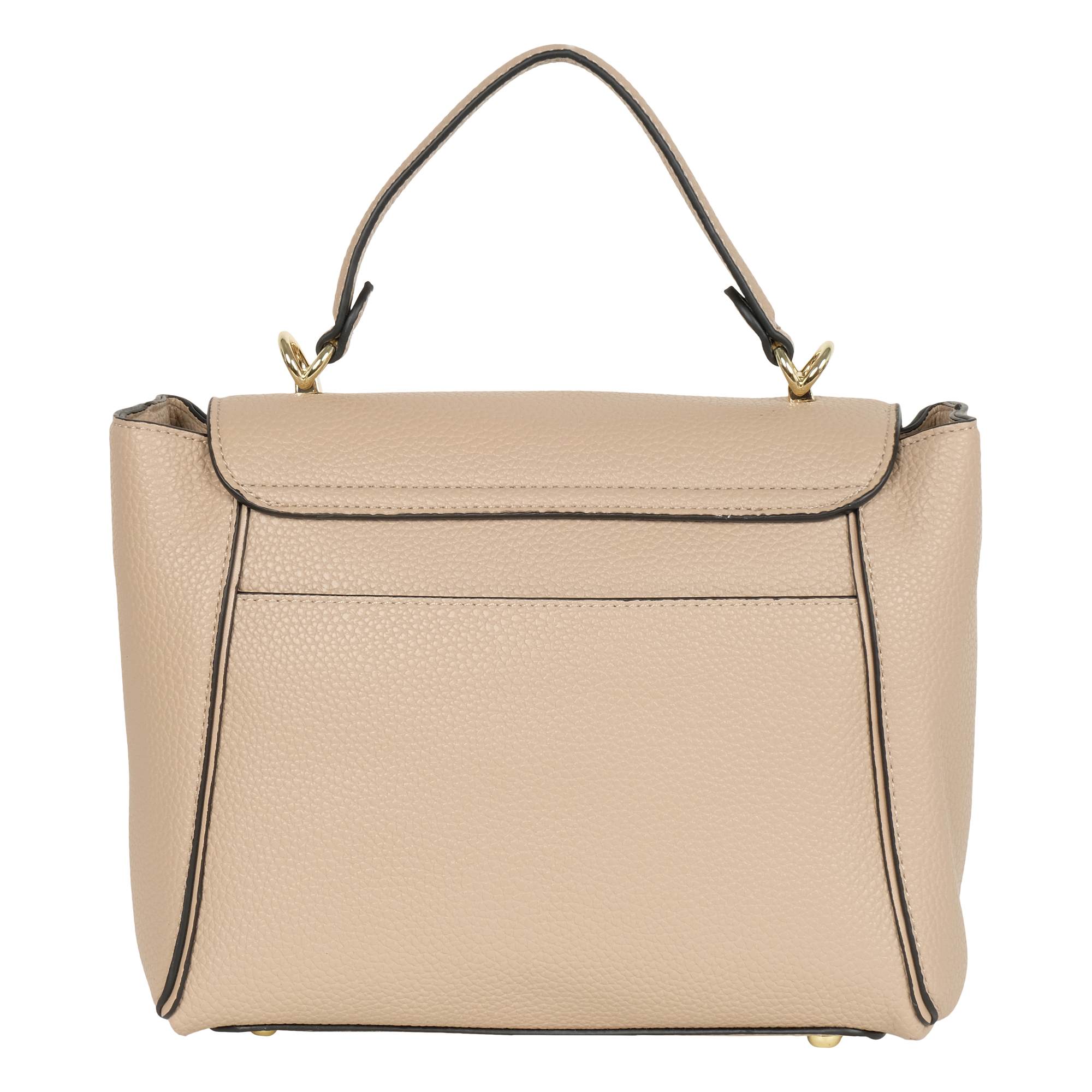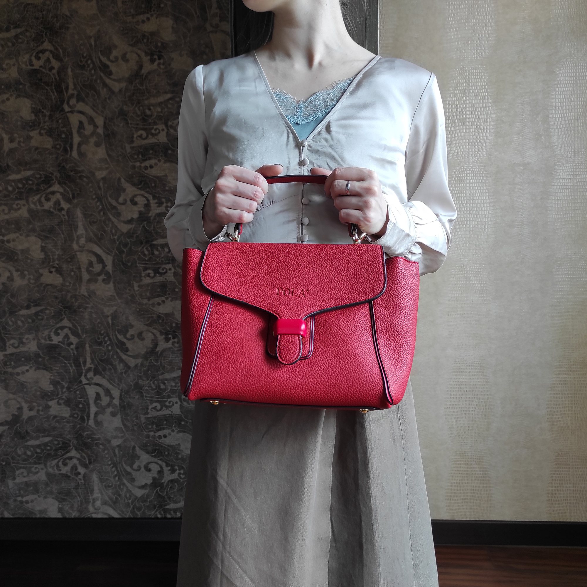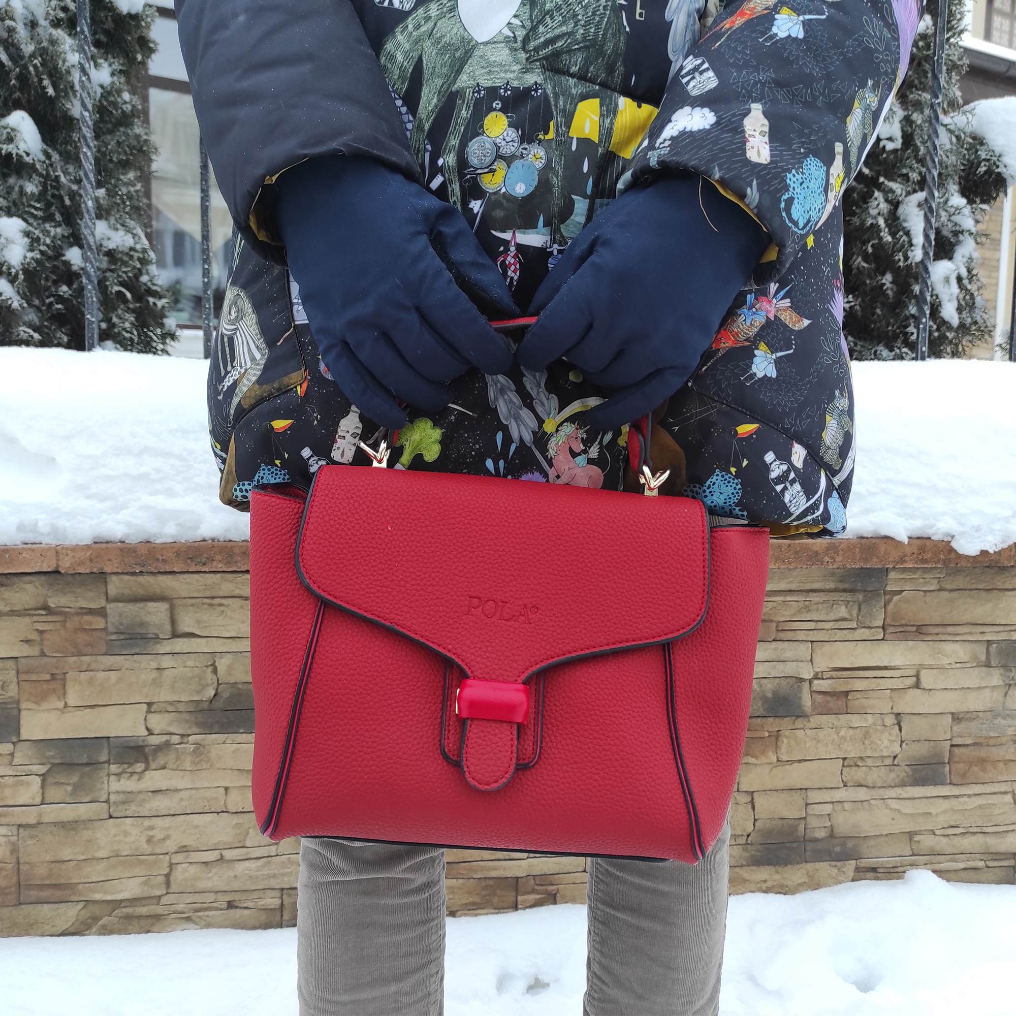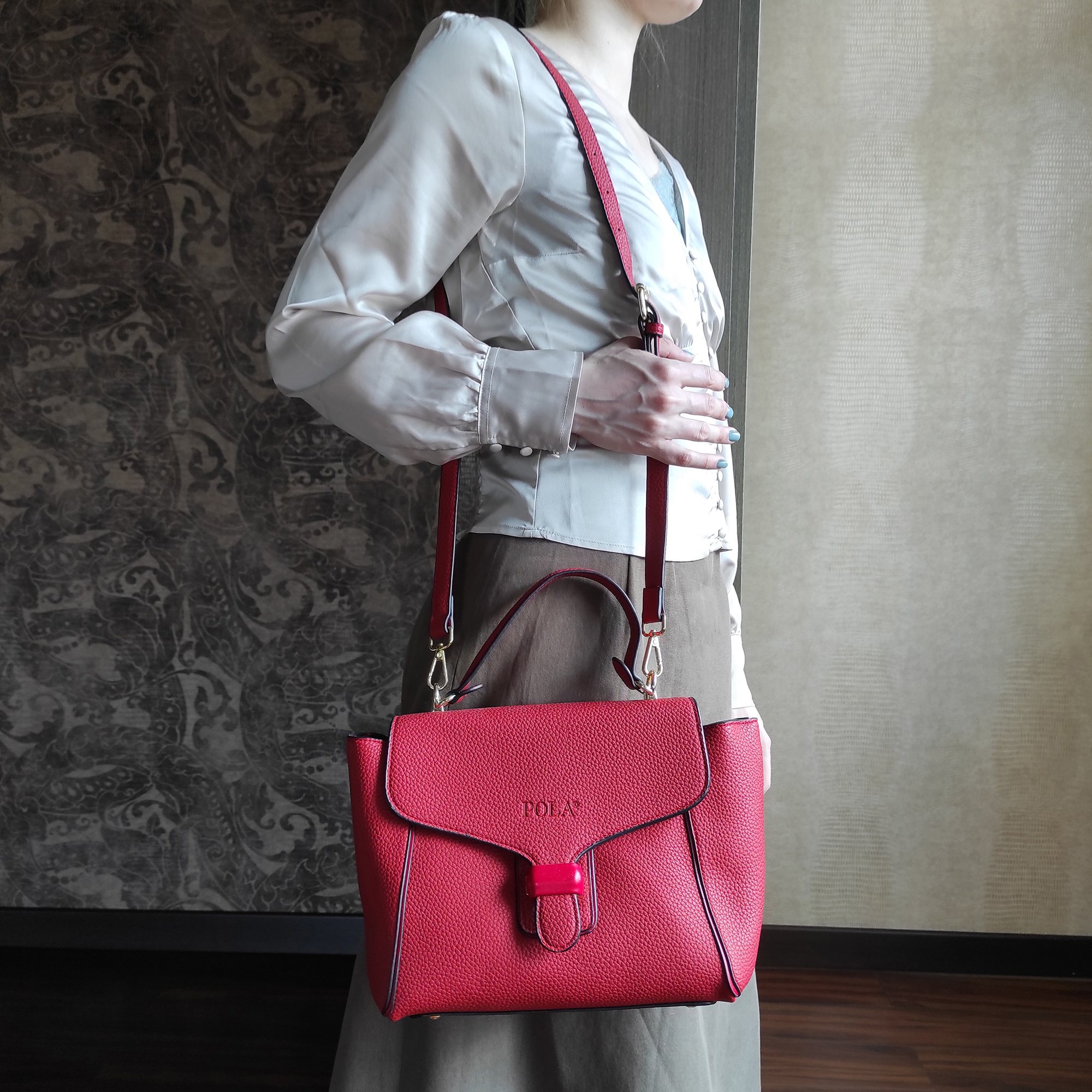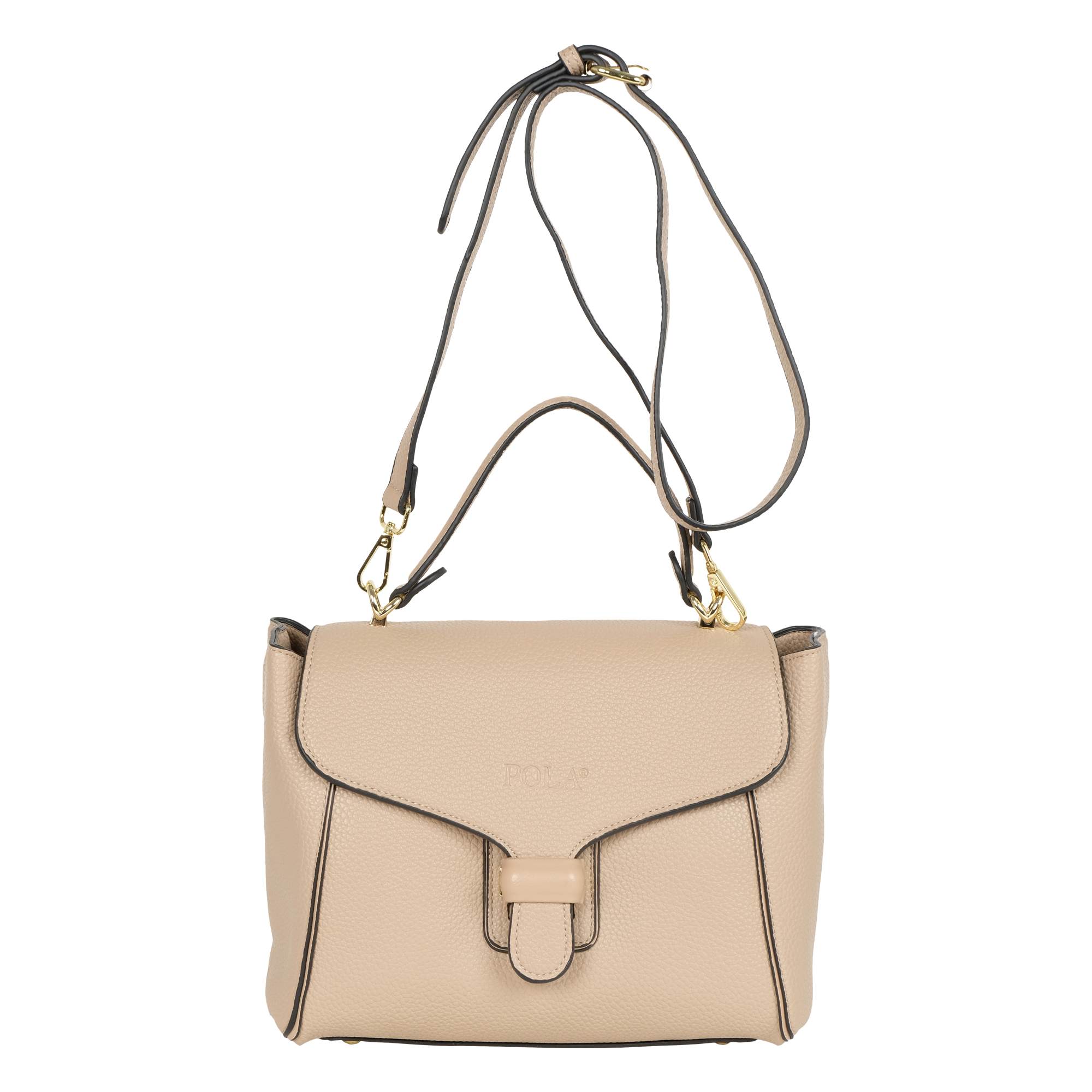Стильная сумка фирмы Pola выполнена из экокожи и является прекрасным аксессуаром. Сумочка имеет трапециевидную форму. Основное отделение на молнии, сверху закрывается на металлическую защелку. Внутри один карман на молнии и один открытый кармашек. У сумки есть ручка для переноски, высота которой составляет 11 см и съёмный, тонкий, регулируемый ремешок, длина которого- 115см. Цвет фурнитуры-золото.