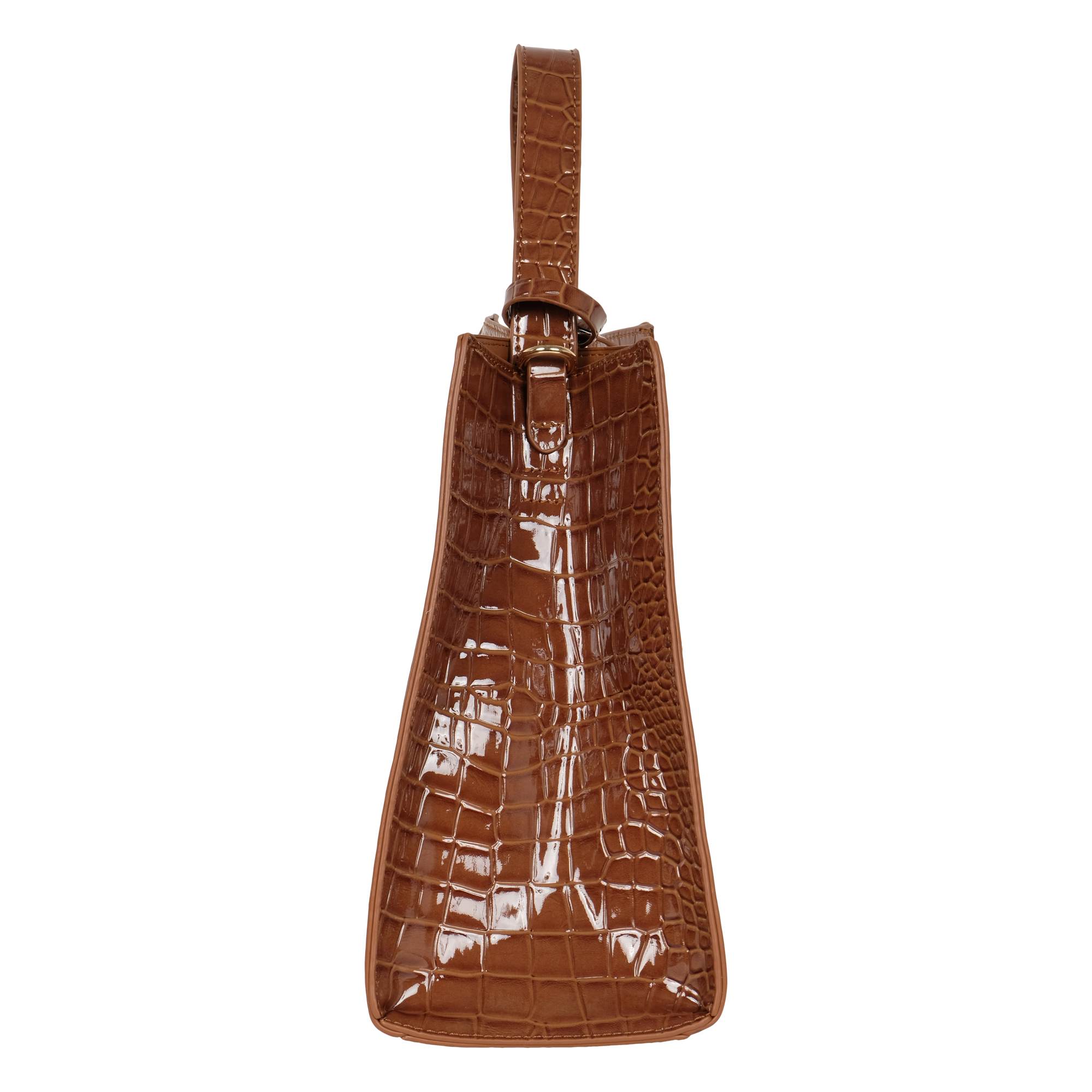 Оригинальная, стильная сумка Pola трапециевидной формы выполнена из лаковой экокожи без подкладки с имитацией кожи рептилии и прекрасно подходит для ежедневного использования модницами любого возраста. Данная модель закрывается металлическим поворотный замком. Внутри один открытый кармашек. У сумки есть ручка для переноски, высота которой 12 см и съёмный, регулируемый плечевой ремень, максимальная длина которого 104 см. Цвет фурнитуры-золото.