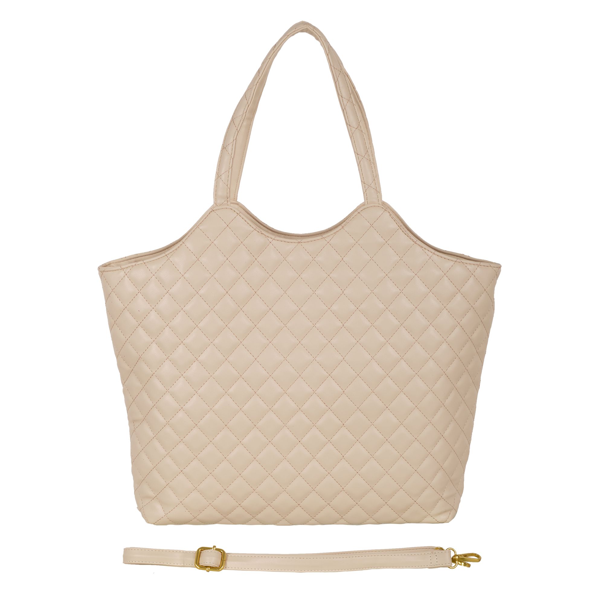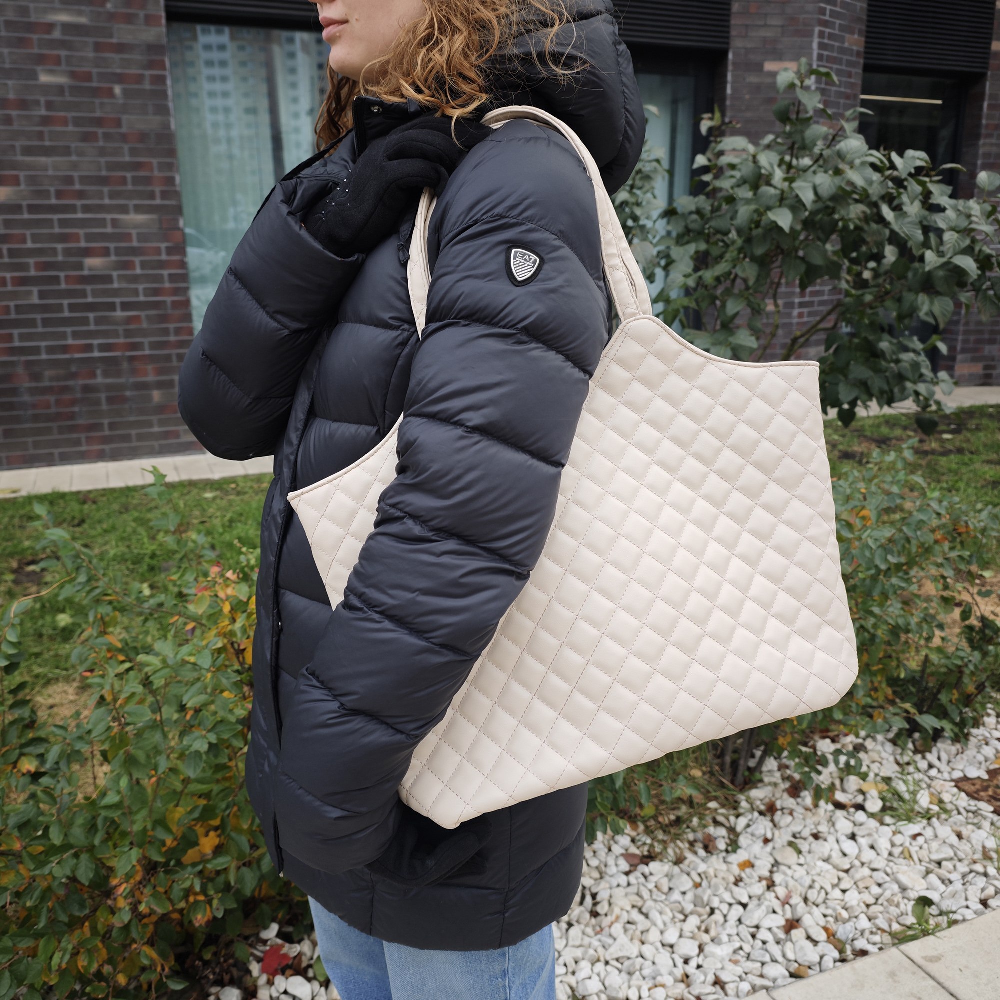 Вместительная стеганая женская сумка Pola выполнена из экокожи. Данная модель продолжает удерживать лидирующие позиции среди трендов! Данную модель можно классифицировать как-сумка тоут, сумка шоппер, сумка хобо. Основное отделение закрывается на молнию. Внутри два кармана на молнии и открытый кармашек. Вмещает формат А4. Сумку можно переносить с помощью двух ручек, высота которых составляет 26 см, а также на плече с помощью съёмного регулируемого ремня, длина которого составляет 134 см. Цвет фурнитуры-золото.