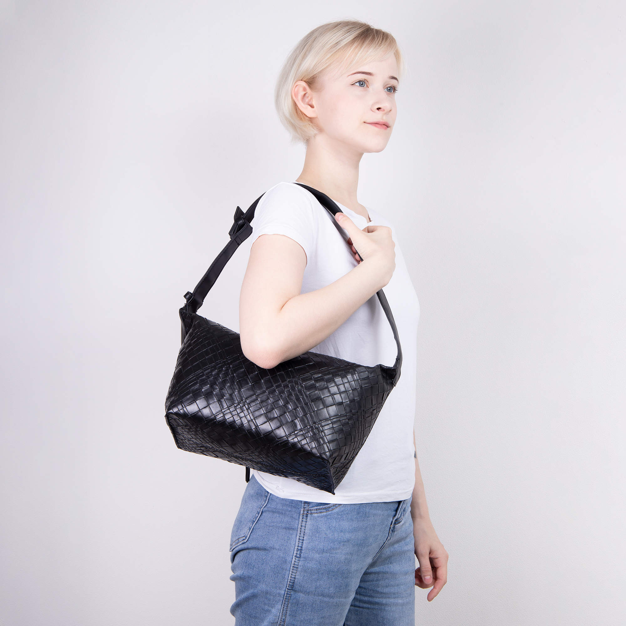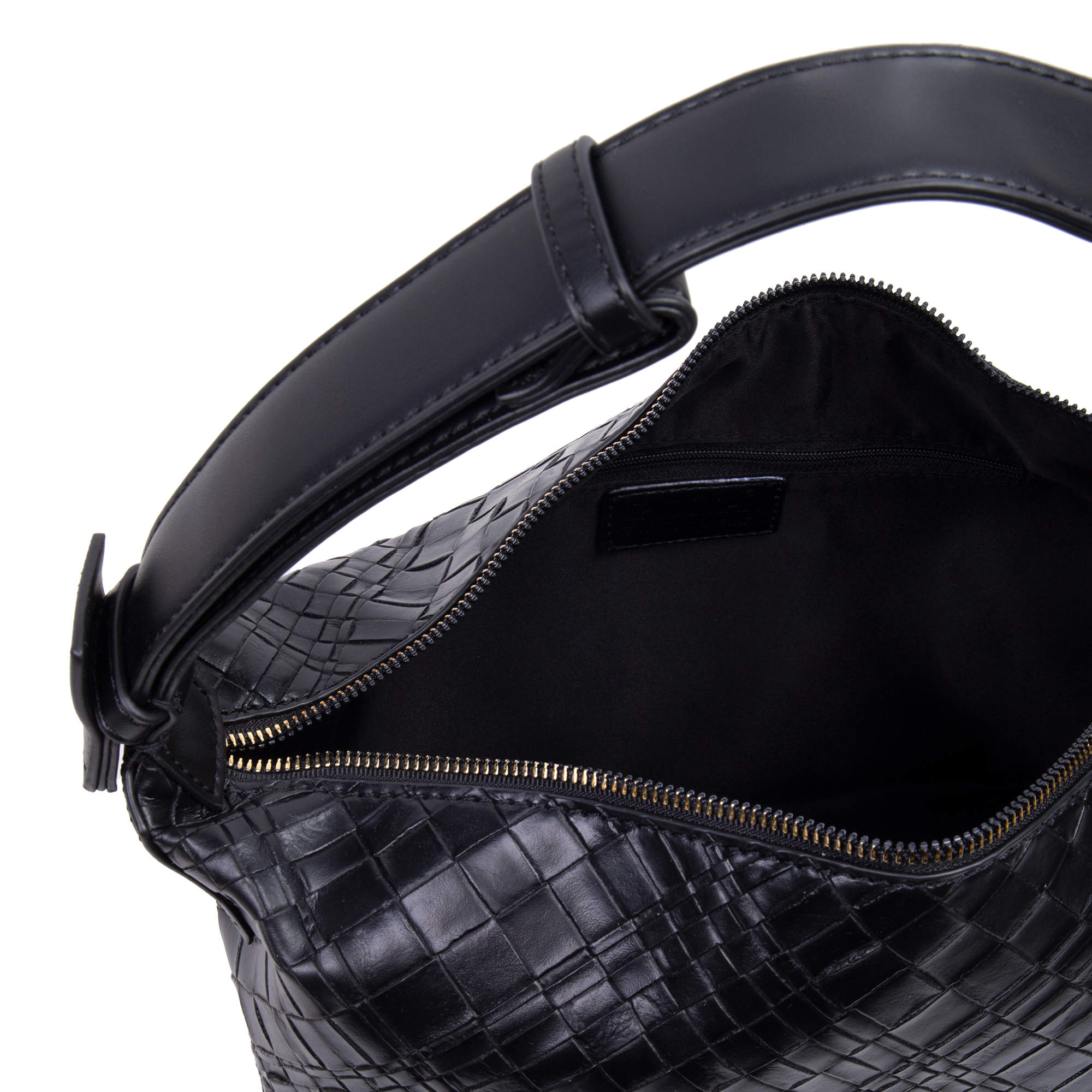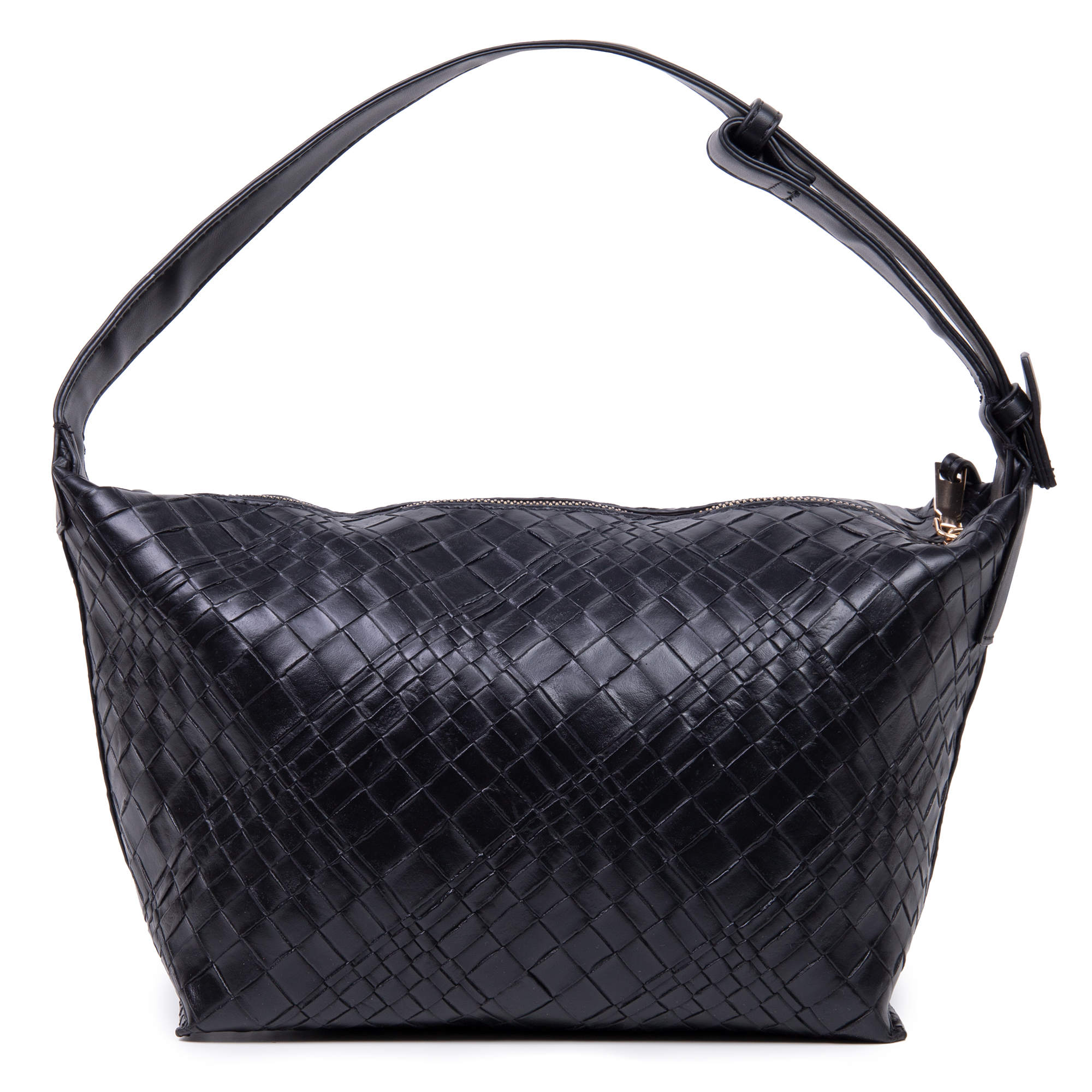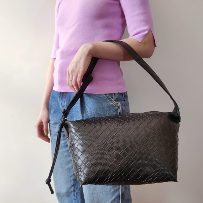 Стильная сумка фирмы Pola выполнена под плетение из экокожи. Основное отделение закрывается на молнию. Внутри есть карман на молнии и открытый карман. Сумку можно переносить с помощью ручки высота 20см. Данная модель очень элегантна и великолепно подходит для ежедневного использования. Цвет фурнитуры-золото.