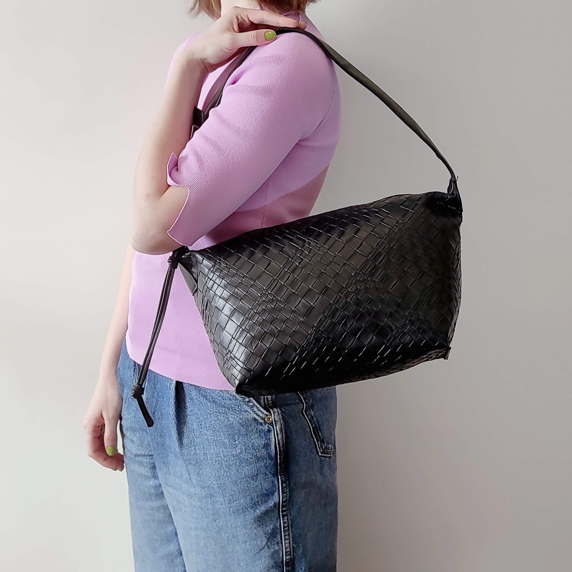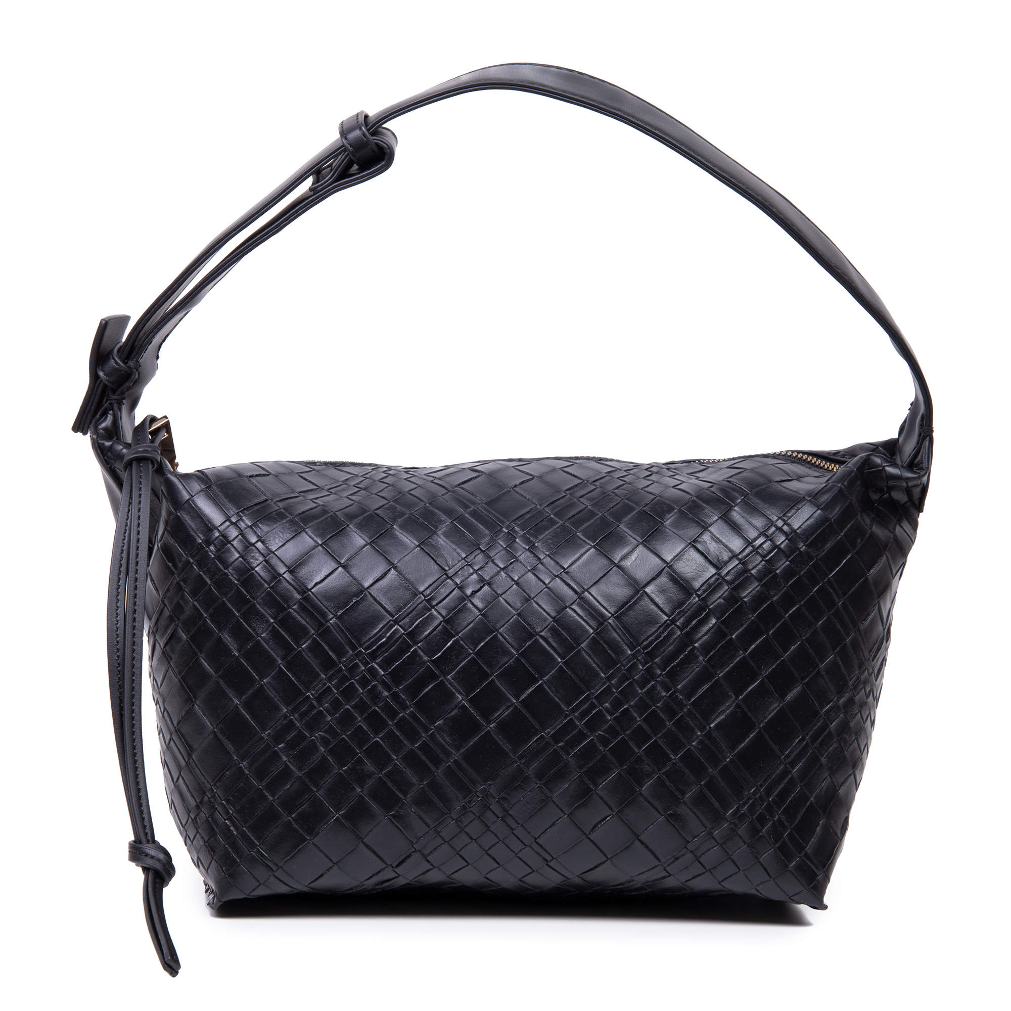 Стильная сумка фирмы Pola выполнена под плетение из экокожи. Основное отделение закрывается на молнию. Внутри есть карман на молнии и открытый карман. Сумку можно переносить с помощью ручки высота 20см. Данная модель очень элегантна и великолепно подходит для ежедневного использования. Цвет фурнитуры-золото.