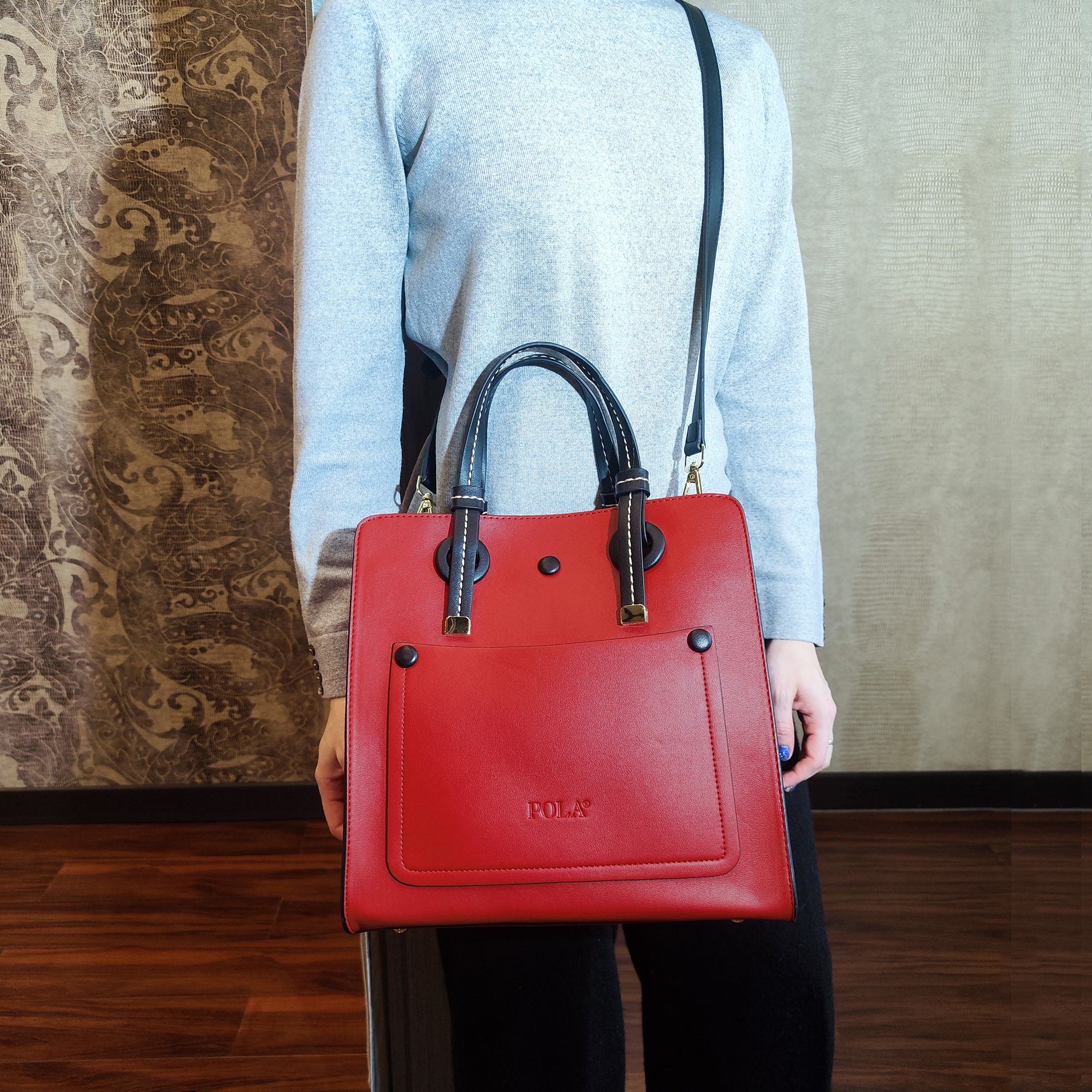 Стильная женская сумка фирмы Pola выполнена из экокожи и предназначена для повседневного использования. Основное отделение закрывается на металлическую молнию и разделено кармашком на молнии на два отделения. Внутри сумочки есть два кармана на молнии и два открытых. Отличительной особенностью данной модели является наличие с двух сторон боковых отделений в виде карманов на магнитной кнопке. Спереди сумки есть небольшой накладной карман. У сумки есть ручки для переноски, высота которых составляет 15 см, тонкий регулируемый ремешок длина которого- 112 см. Цвет фурнитуры-золото.