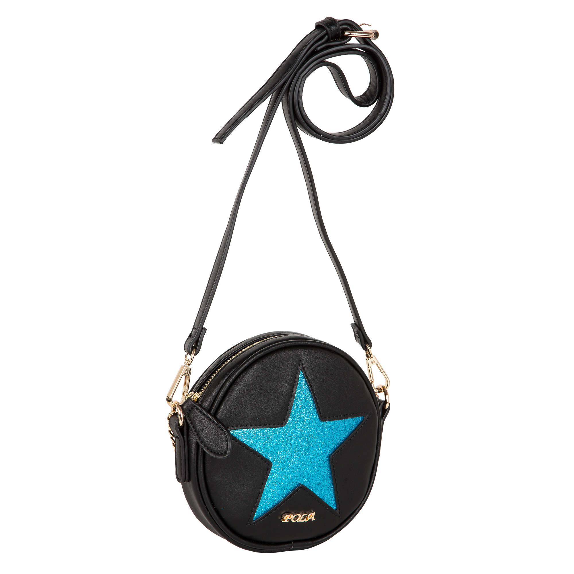 Ультрамодная, миниатюрная сумка абсолютно круглой формы Pola выполнена из экокожи и великолепно подходит как для создания вечернего образа, так и и для повседневного использования модницами. Данная модель по центру декорирована крупной яркой звездой различной цветовой гаммы. Сумочка закрывается на металлическую молнию. Особую изысканность данной сумке придаёт ручка- цепочка, в комплект входит съёмный регулируемый ремень, длина которого составляет 116 см. Цвет фурнитуры-золото.