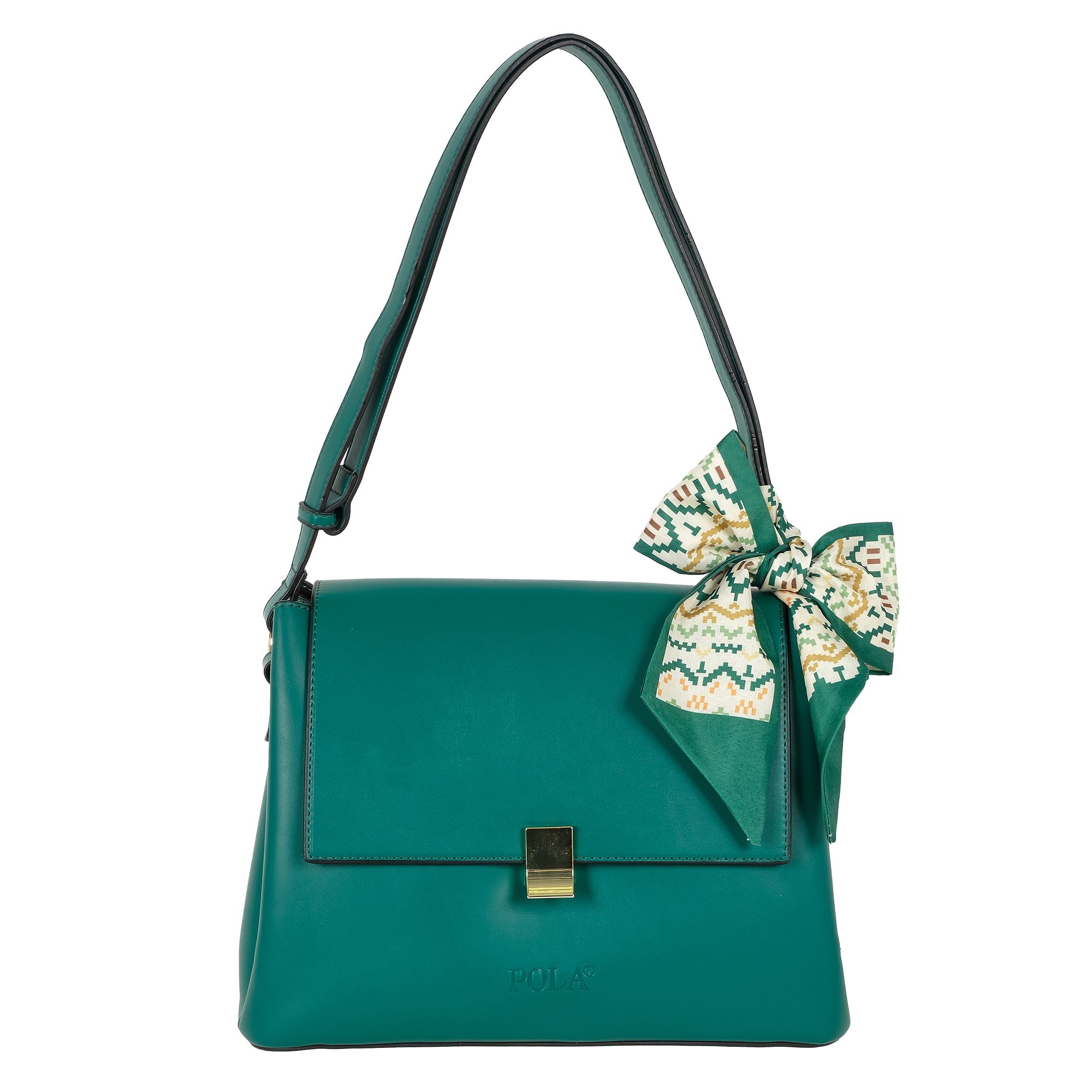 Стильная женская сумка фирмы Pola выполнена из экокожи и украшена платком. Основное отделение закрывается на клапан с помощью металлического замка-защелки и металлическую молнию. Внутри сумки есть маленький карман на молнии и один открытый. Сумка прекрасно подойдёт для повседневной носки. У сумки есть регулируемая ручка для переноски, высота которой составляет 45 см их можно украсить платком. Есть тонкий регулируемый ремешок длина которого- 121 см. Цвет фурнитуры-золото.