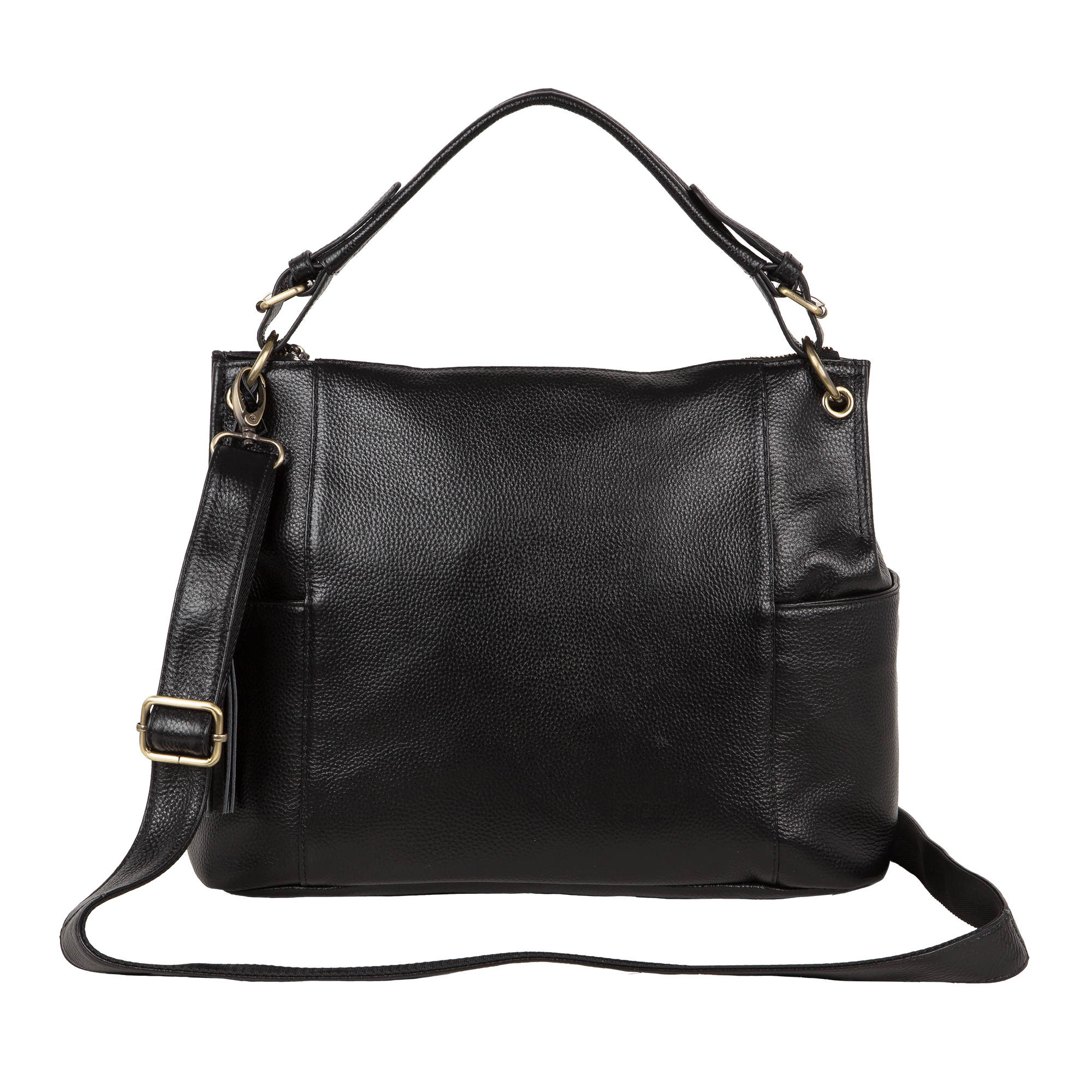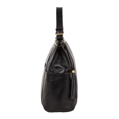 Стильная сумка Pola выполнена из натуральной кожи. Основное отделение закрывается на молнию. Внутри расположены два открытых небольших кармашка и один карман на молнии для документов. Сзади также расположен вместительный карман на молнии, отлично подойдет для карточек и ключей. По бокам карманы на магнитной кнопке. У данной модели есть функциональная съёмная ручка максимальная высота 13см и съёмный регулируемый наплечный ремень максимальная длина 140см завершают стильный дизайн. Цвет фурнитуры – золото.